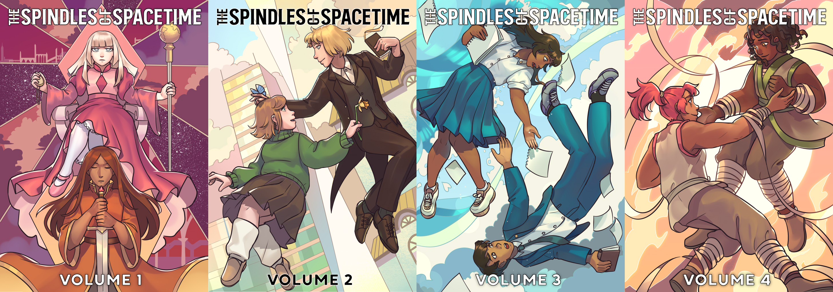 The Spindles of Spacetime is a genre-bending novel series featuring an LGBT+ cast from all across space and time, from alternate histories to fantasy realms to worlds just like our own. It explores colonialism, power asymmetries, birthrights, intergenerational cruelty—and a simple question: Do you want the universe to exist? Do you want to exist?