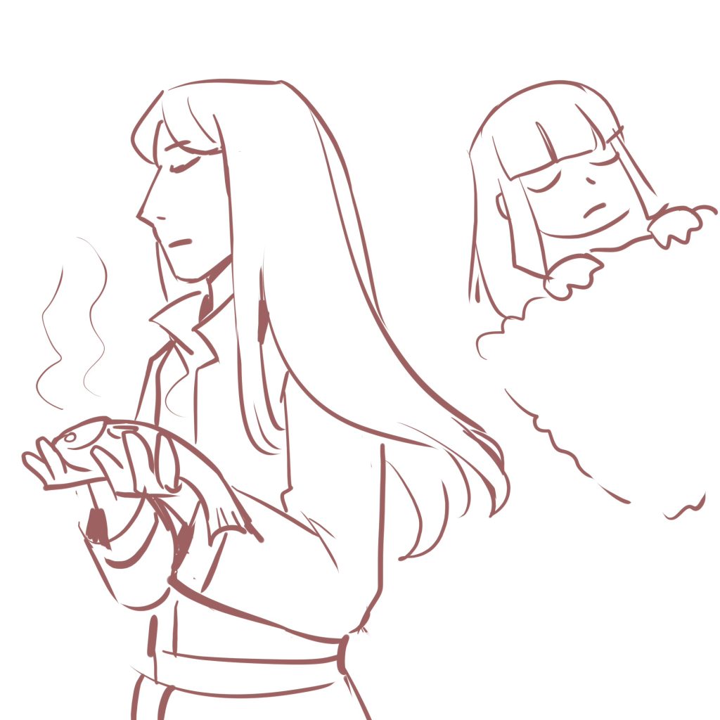 - Dorian cooking a fish (Chapter 45) while Orobelle naps next door. I still laugh about that mini scene sometimes. He’s never cooked a fish in his life (his homeland doesn’t have much in the way of bodies of water) so he definitely overestimates how much heat they take to cook through. I think Orobelle sleeping while he does favours for everyone else is pretty indicative of their dynamic.